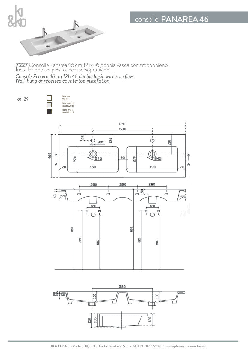 Lavabo da incasso, a consolle, con doppia vasca, disponibile in due dimensioni. Con foro rubinettera e troppo pieno. Accessori esclusi.