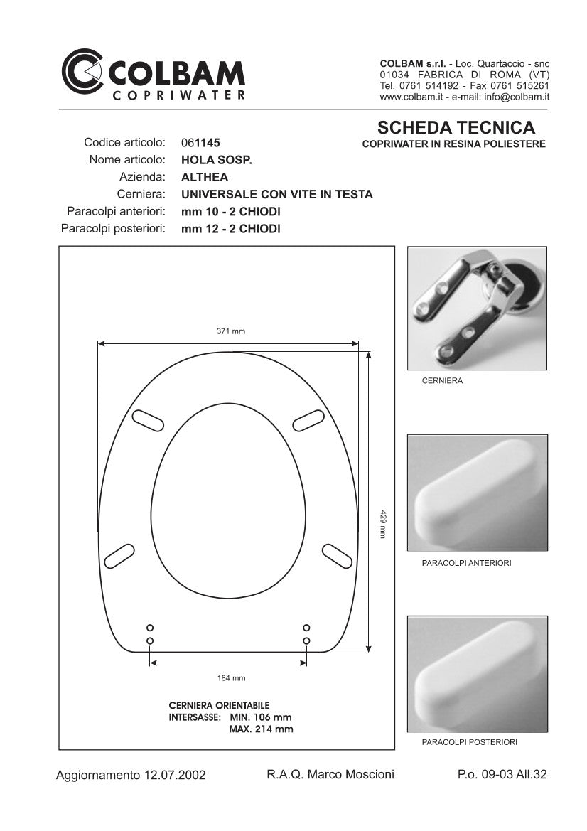 Copriwater compatibile con water serie Hola sospeso della ceramica Althea in resina poliestere.