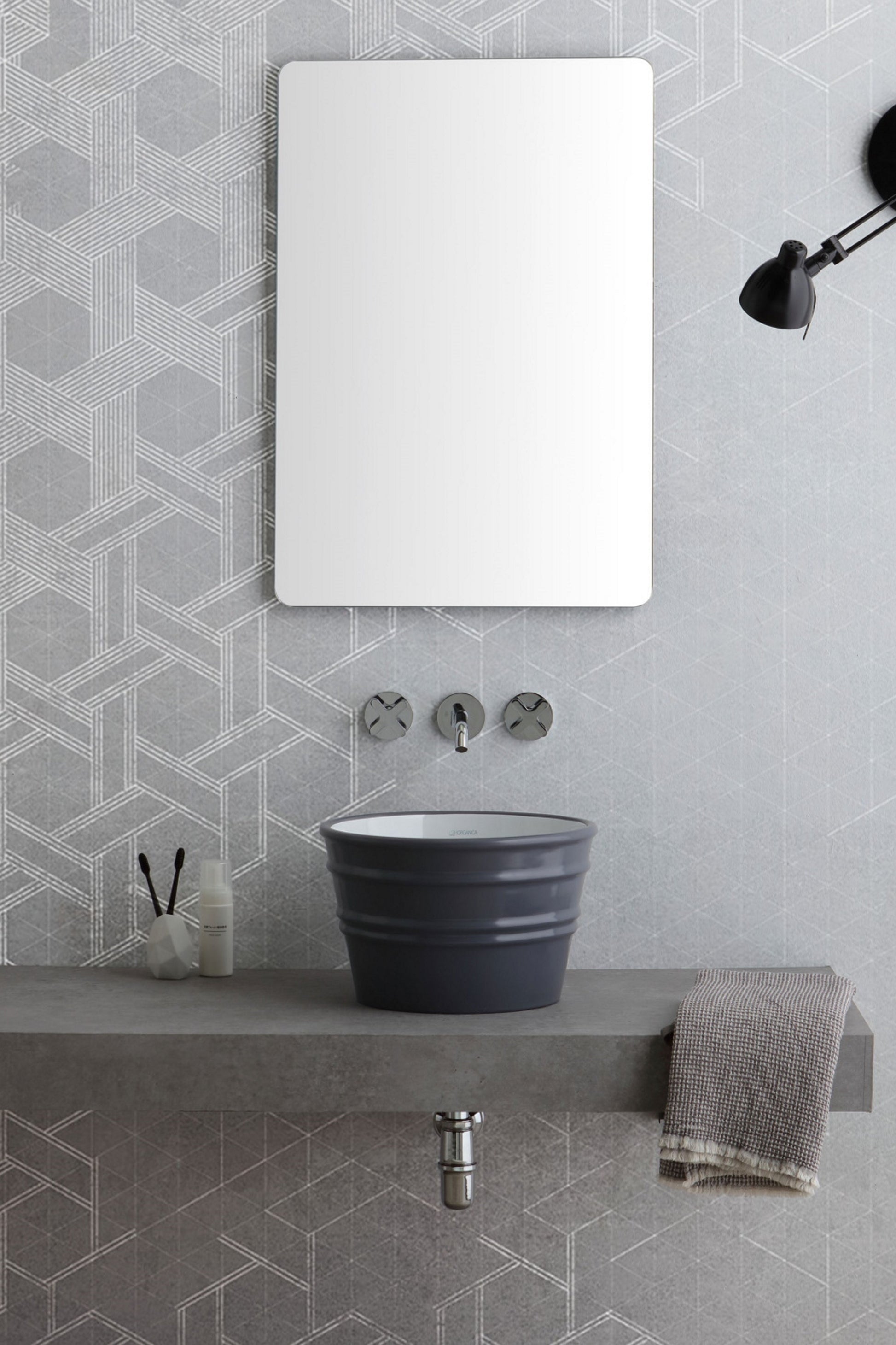 Lavabo d'appoggio o sospeso in ceramica, diametro esterno cm 38 x altezza cm 24. Piletta clip e clap e copripiletta in ceramica esclusi
