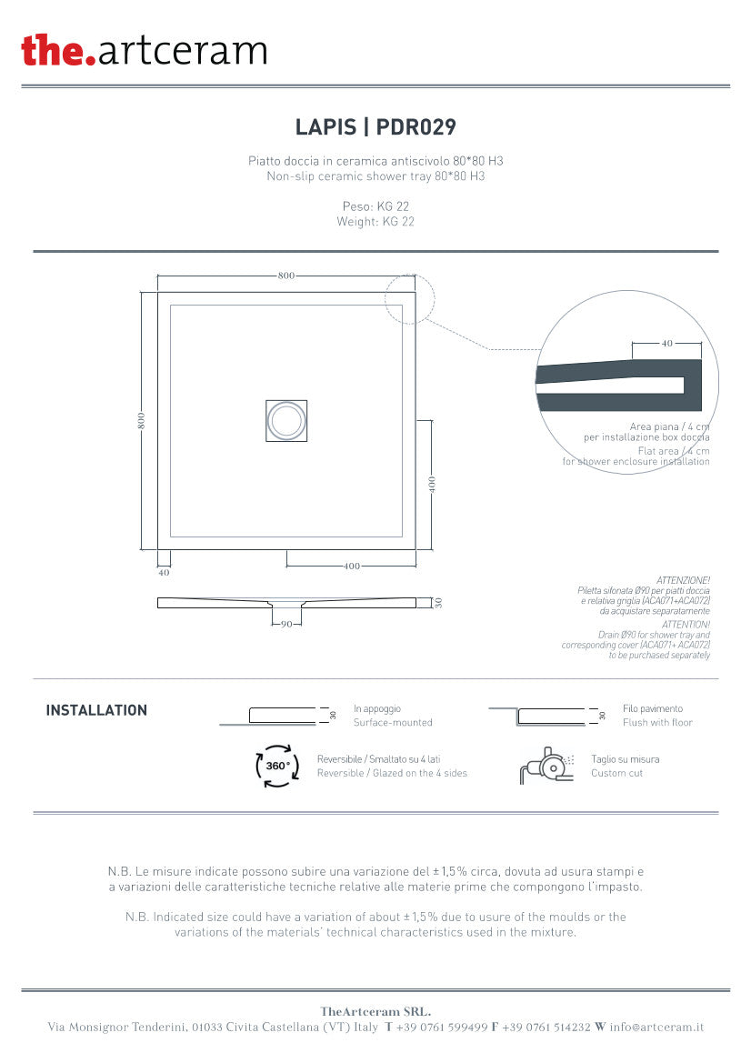 Piatto doccia in ceramica antiscivolo, piletta esclusa