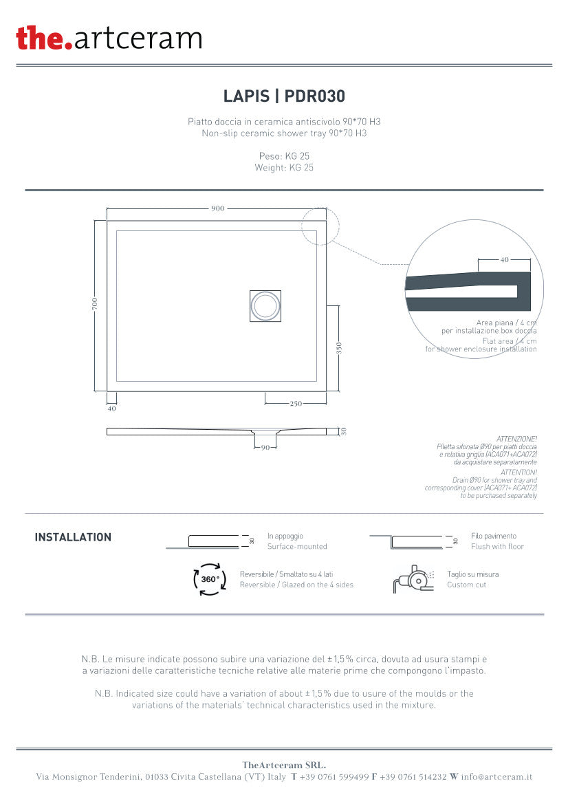 Piatto doccia in ceramica antiscivolo, piletta esclusa
