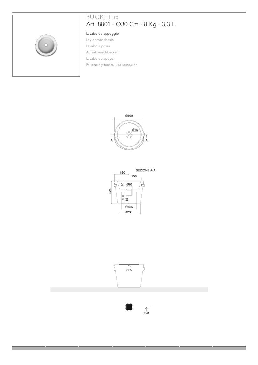 Il lavabo è realizzato in ceramica bianca; senza foro e senza troppopieno, può essere installato solo su un piano in legno o marmo, su una panca o un mobile.