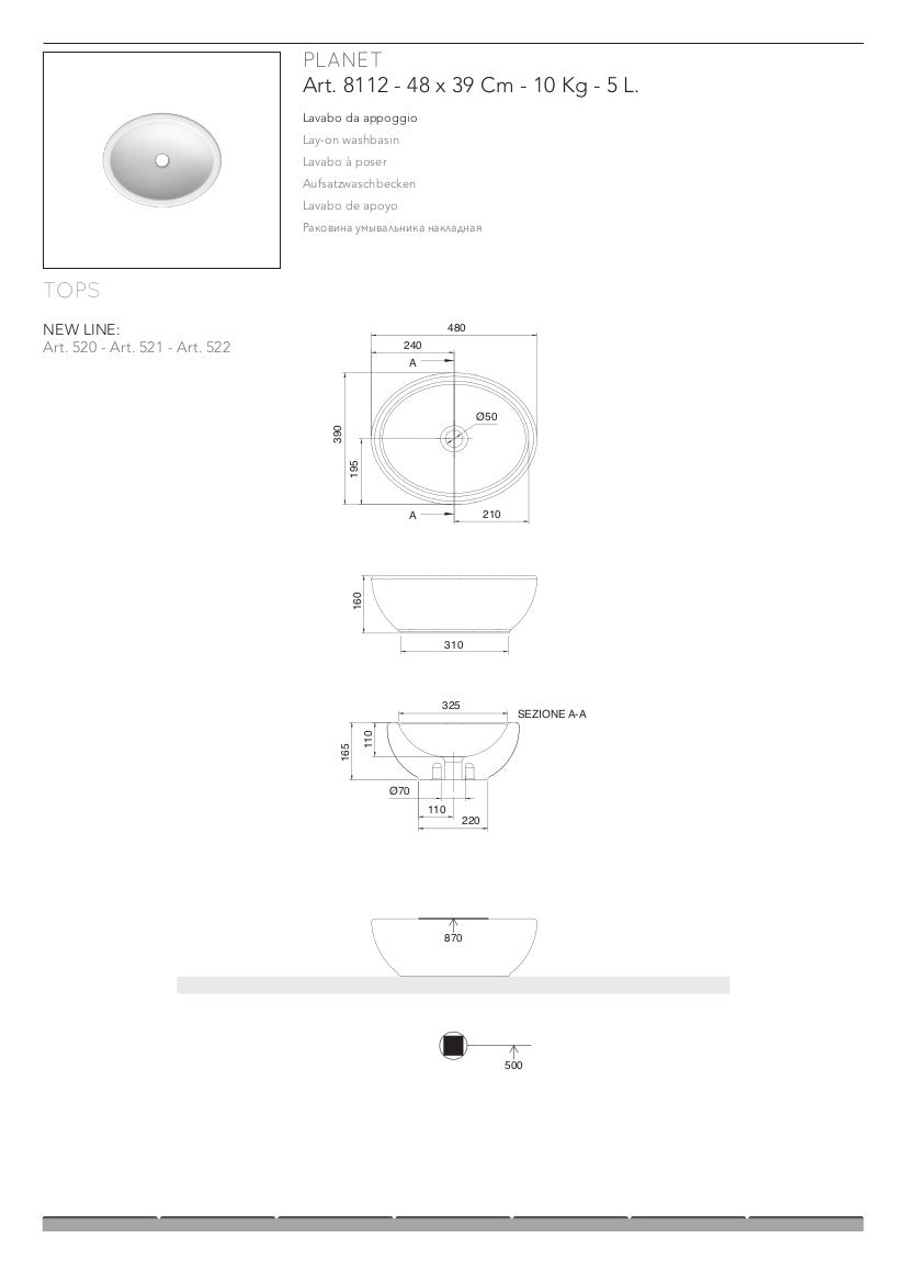 Lavabo ovale Planet in ceramica bianca, senza foro per rubinetto e senza troppopieno. Può essere installato solo su un mobile, un piano in legno e una panca.