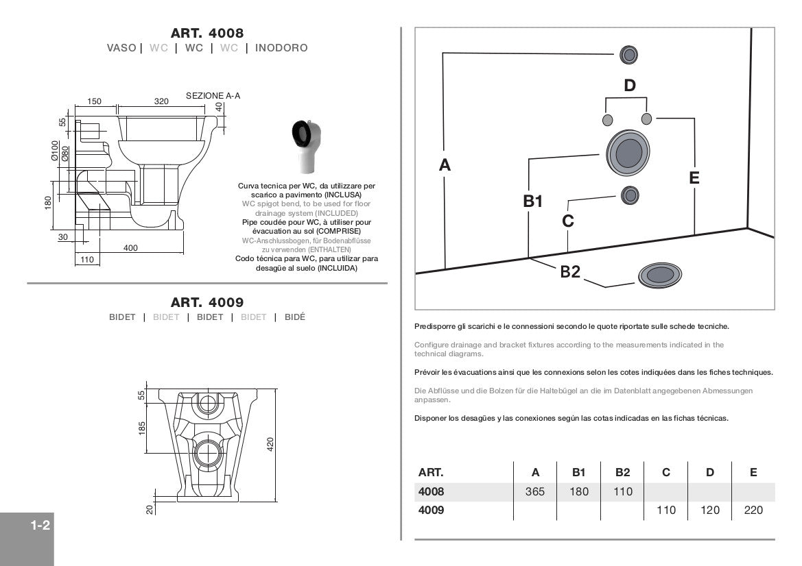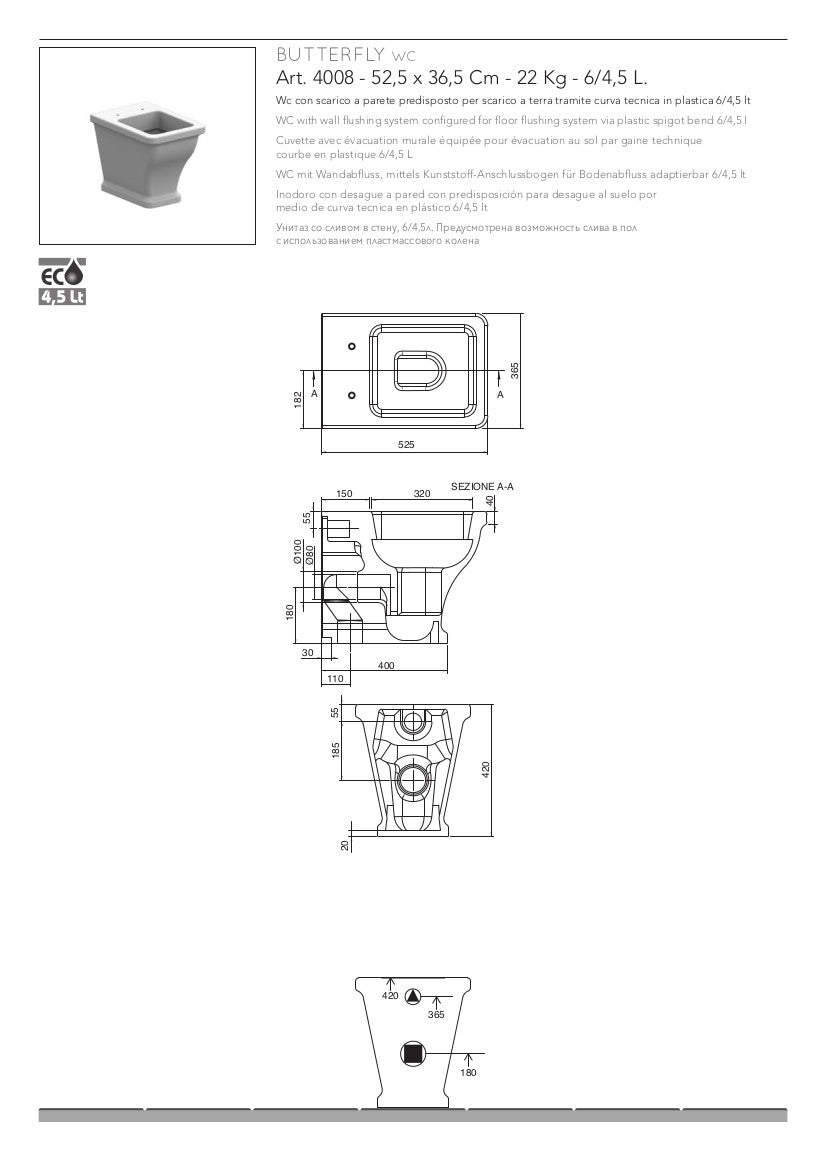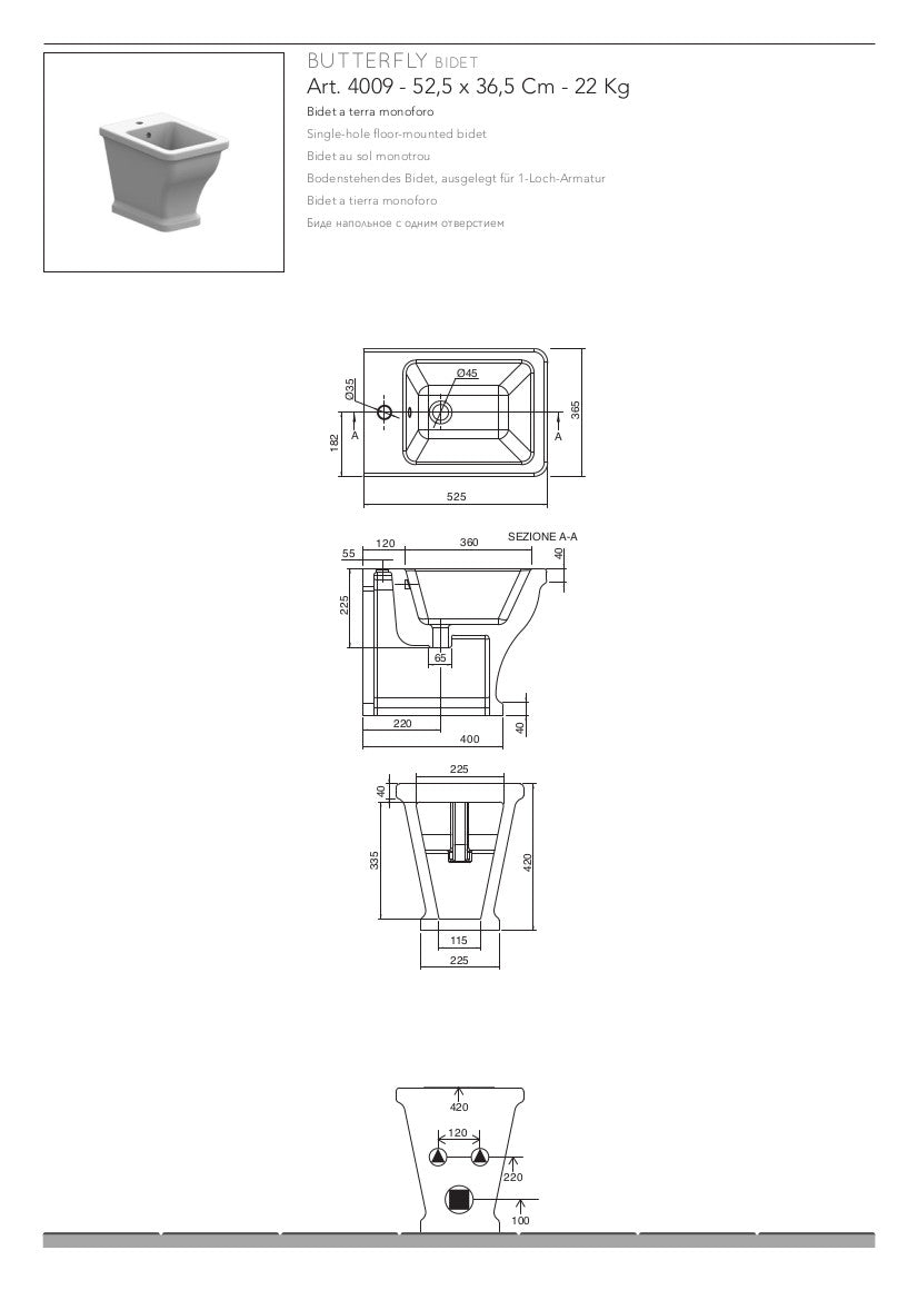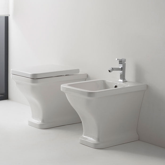 I sanitari a terra della serie Butterfly sono realizzati in ceramica bianca; il vaso ha un fianco a muro non smaltato e uno scarico a parete convertibile a pavimento tramite una curva tecnica in plastica, mentre il bidet Butterfly è dotato di rubinetto monoforo.
